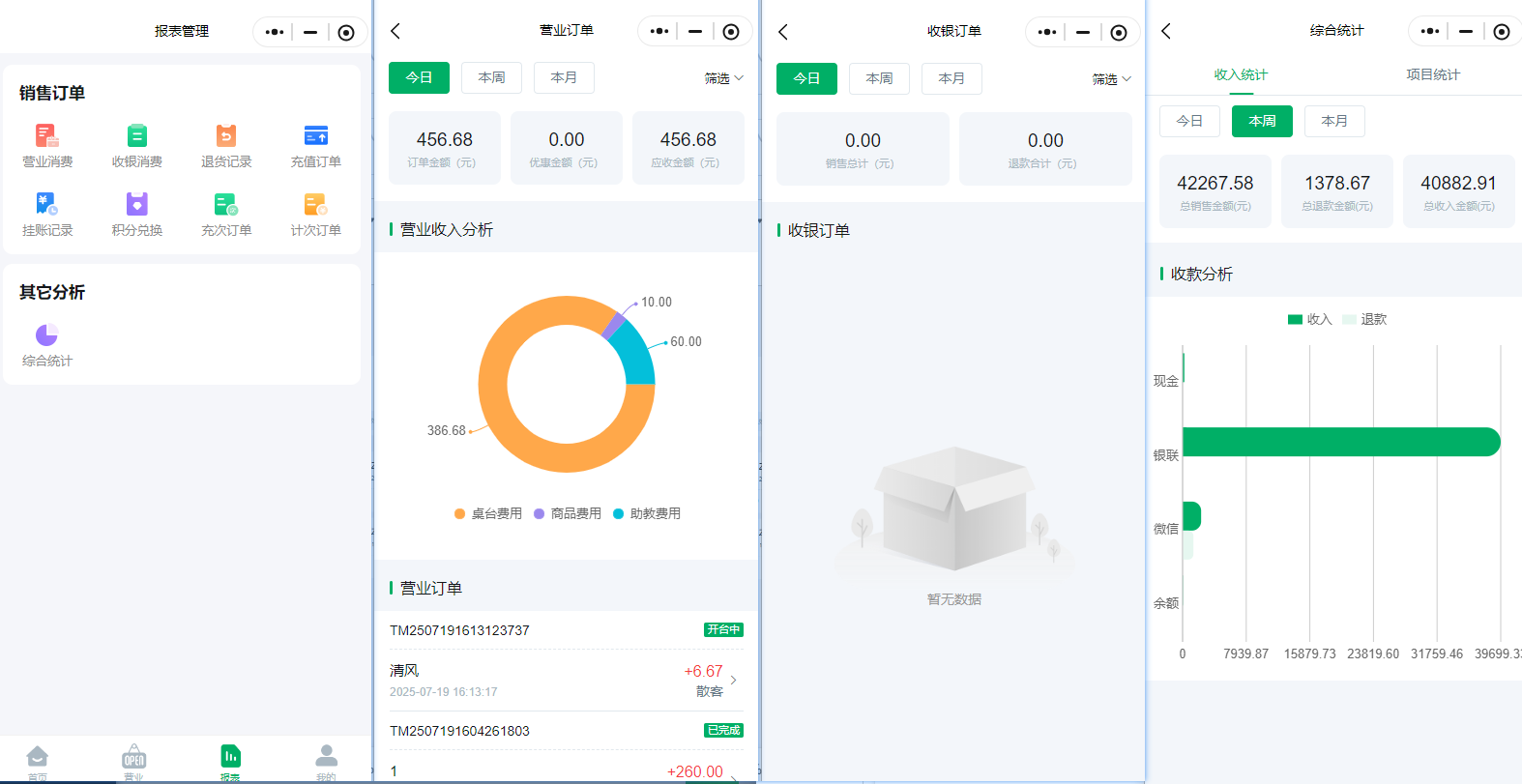 6.报表中增加了销售订单统计,包含营业消费、收银消费、退货记录、充值订单、挂账记录、积分兑换、充次订单、计次订单。增加了综合统计,支持分别按项目或收入进行统计分析