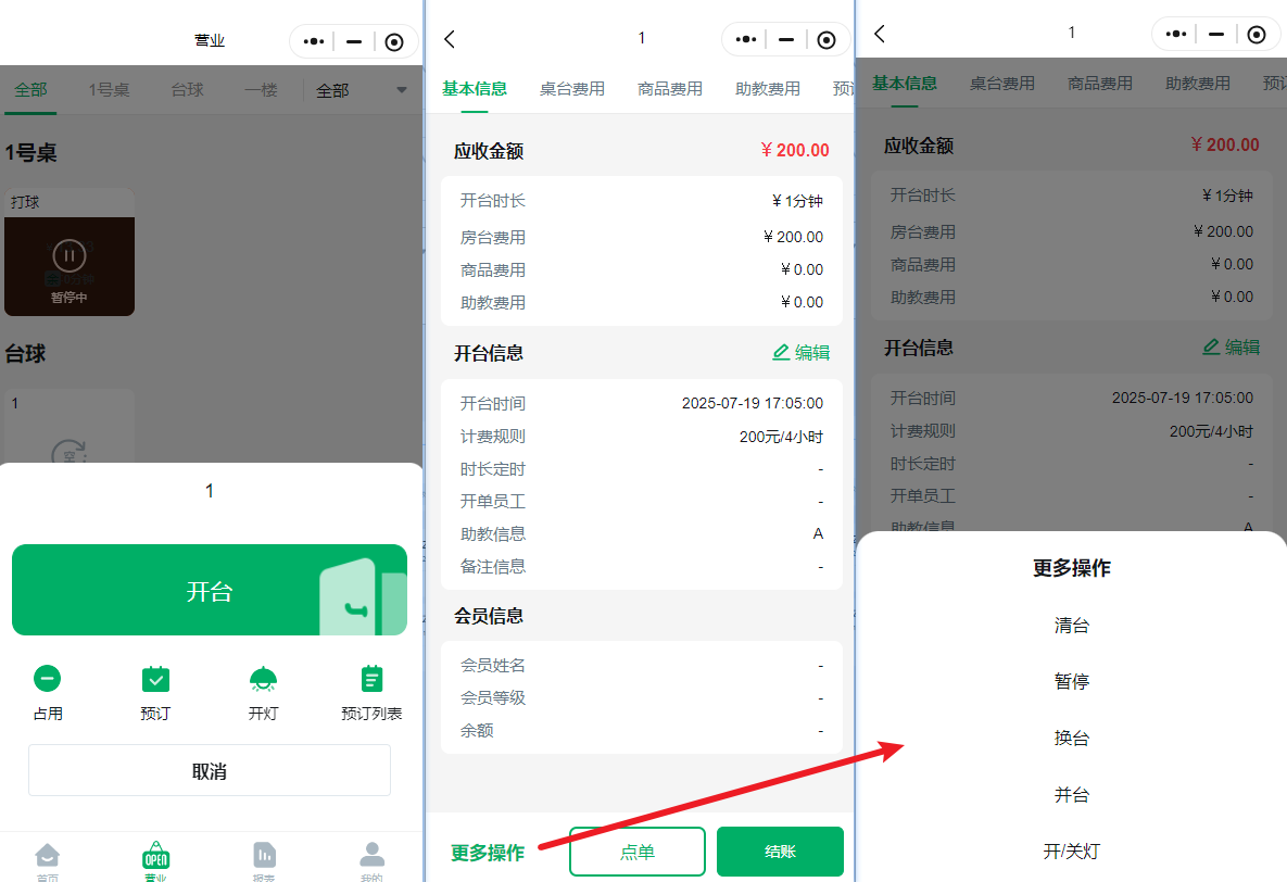 5.营业增加更多操作,包含:清台、暂停/恢复、开/关灯、换台、并台