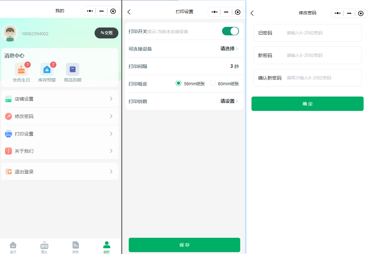 7.我的页面增加了打印设置、退出登录、修改密码相关功能