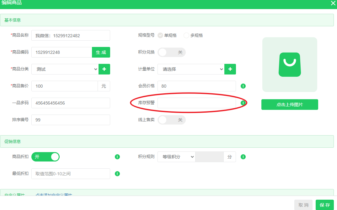 3.1. 库存预警默认值为空,输入0时,该商品库存为0是触发提醒