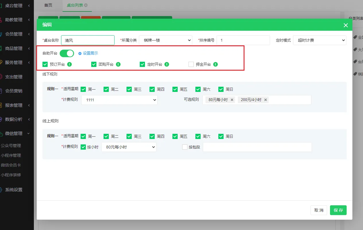 为满足多业态管理需求,系统将各类桌台(茶楼、棋牌、台球等)的线上功能配置进行统一,支持商家按需灵活设置。