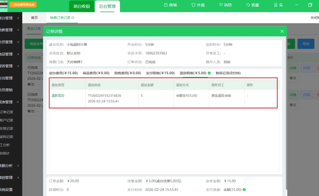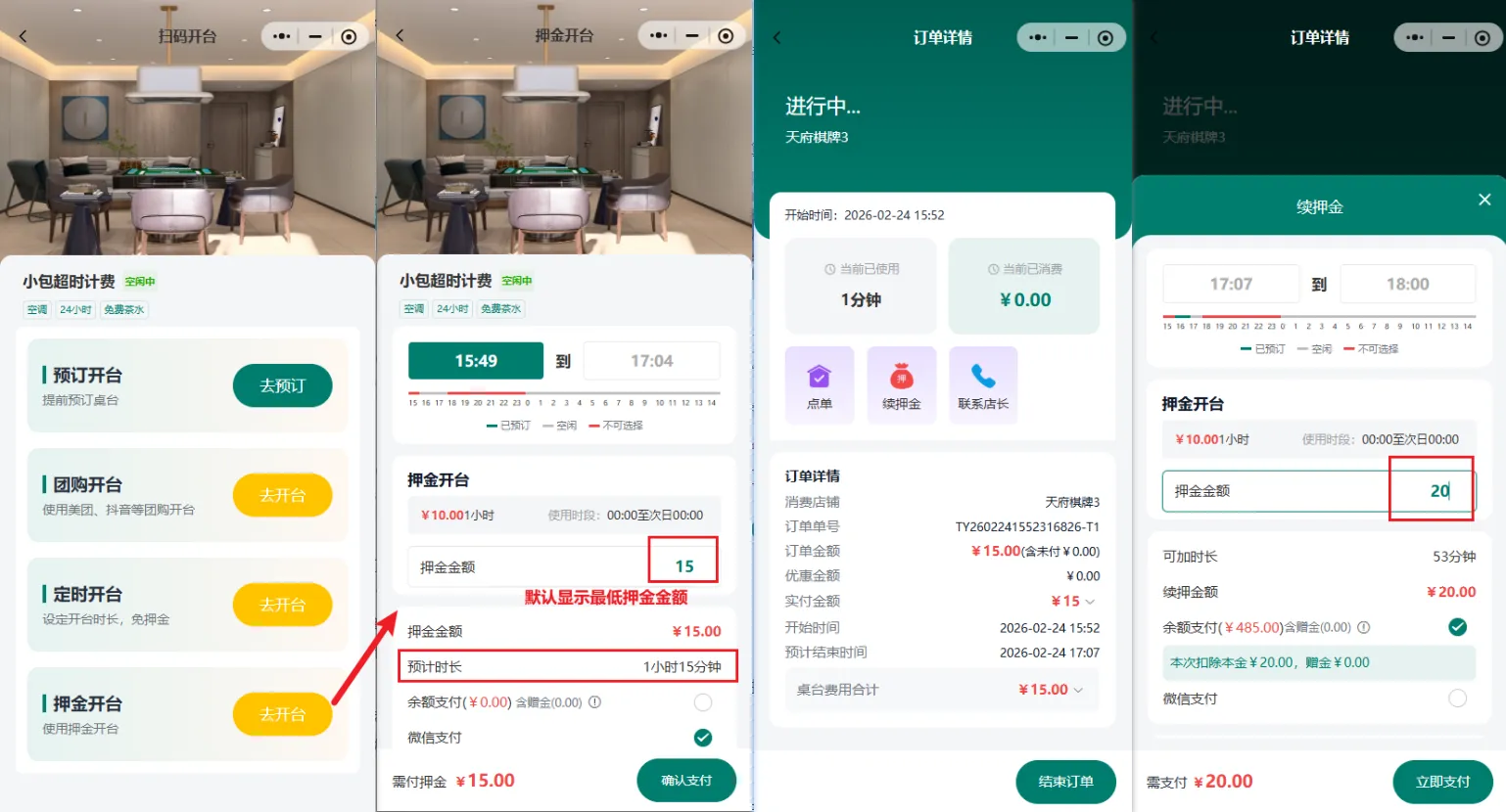- 押金开台支持手动输入押金,系统自动计算结束时间并提示可续押金。
