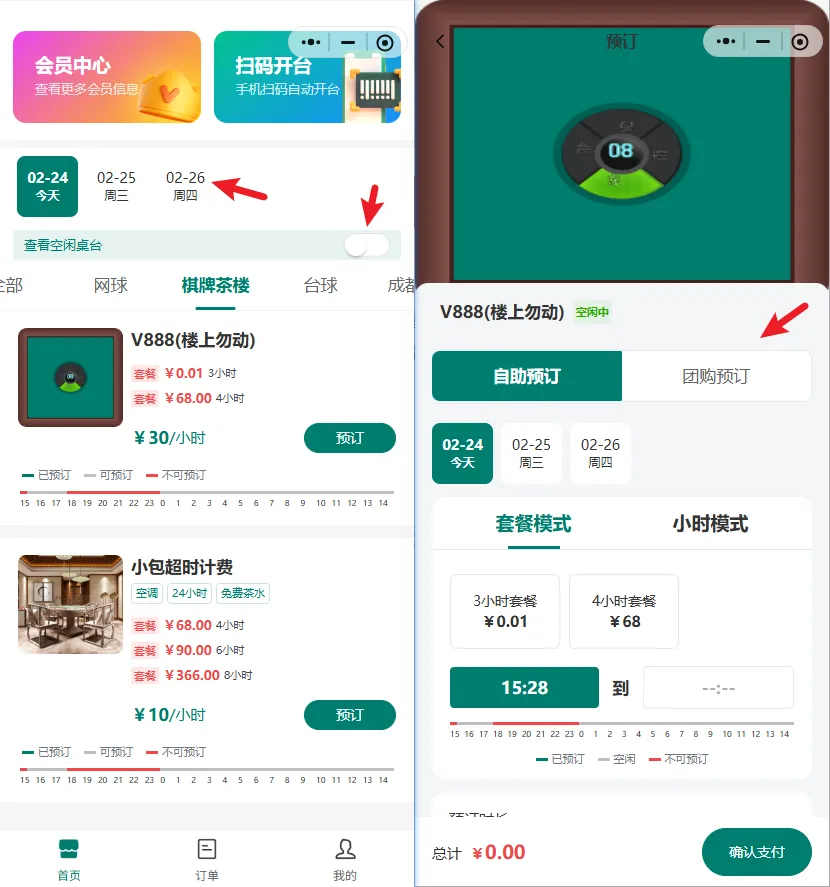 - 预订流程细化:增加自助预订、验券预订页签。