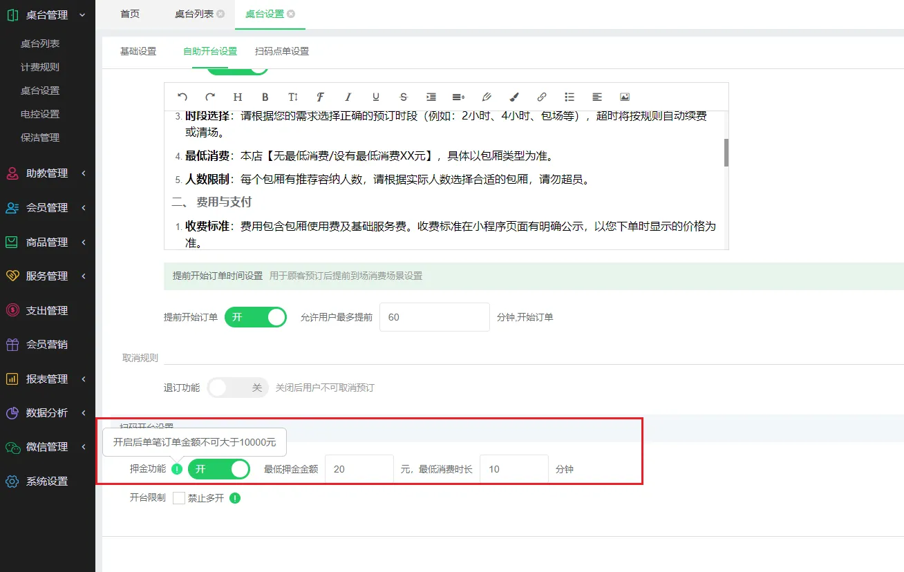 - 押金金额支持设置最低金额(范围:≥最低金额 ≤10000元)。
